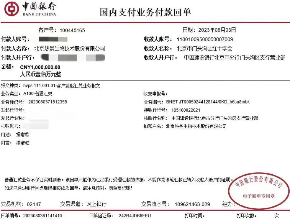 热景生物一直密切关注着汛情救援进展,主动联系相关部门提供支援帮助,并向北京市门头沟区红十字会捐赠100万元防汛抗洪资金,助力当地政府和社会力量抗击灾情。