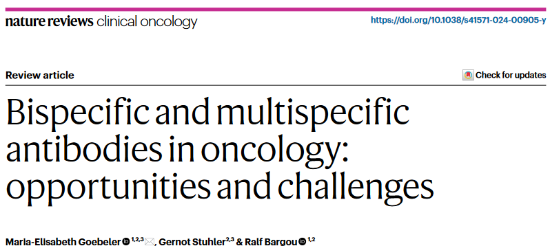 在这篇综述中,德国维尔茨堡大学医院Maria-Elisabeth Goebeler等人讨论了双特异性抗体在癌症患者中的作用,包括历史和发展,以及创新的靶向策略、临床应用和不良事件。此外,作者还讨论了新的替代双特异性抗体构建体,例如那些靶向肿瘤细胞或位于肿瘤微环境中的细胞表达的两种抗原的构建体。最后,作者还介绍了这一快速发展领域的未来研究方向,包括创新的抗体工程策略,这有望使药物递送更有效、克服耐药性,从而优化临床结果。相关工作以“Bispecific and multispecific antibodies in oncology: opportunities and challenges”为题发表在Nature Reviews Clinical Oncology。
