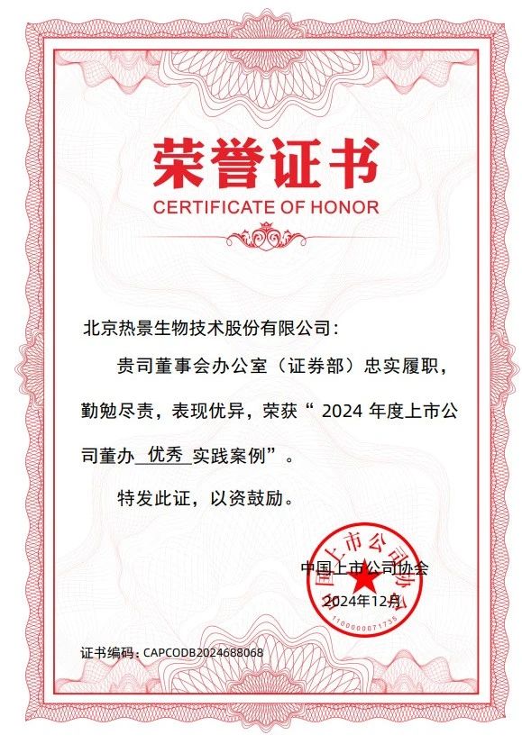 近日,中国上市公司协会开展的“上市公司董办最佳实践案例征集活动”结果揭晓,热景生物荣获“2024年度上市公司董办优秀实践案例”,这也是公司连续第三年获此荣誉。 “上市公司董办最佳实践”案例征集活动是中国上市公司协会对上市公司董事会办公室履职情况进行评价,评价体系涵盖了上市公司董办工作所涉及的信息披露管理事务、公司治理机制建设、投资者关系管理事务等指标,于今年10月启动,经初审、专家委员会评审、诚信核查等环节,最终评出最佳实践案例280家、优秀实践案例300家。其中入选“董办优秀实践案例”的300家上市公司中,沪市上市公司150家,占50%;深市上市公司146家,占48.7%;北交所上市公司4家。
