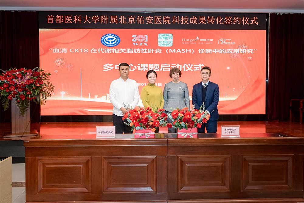 马迎民院长代表我院与大兴区上市企业热景生物就肝病中心三科张晶主任主导研发的“代谢相关脂肪性肝病(MAFLD)关键基因多态性联合检测试剂盒”签订转化协议。