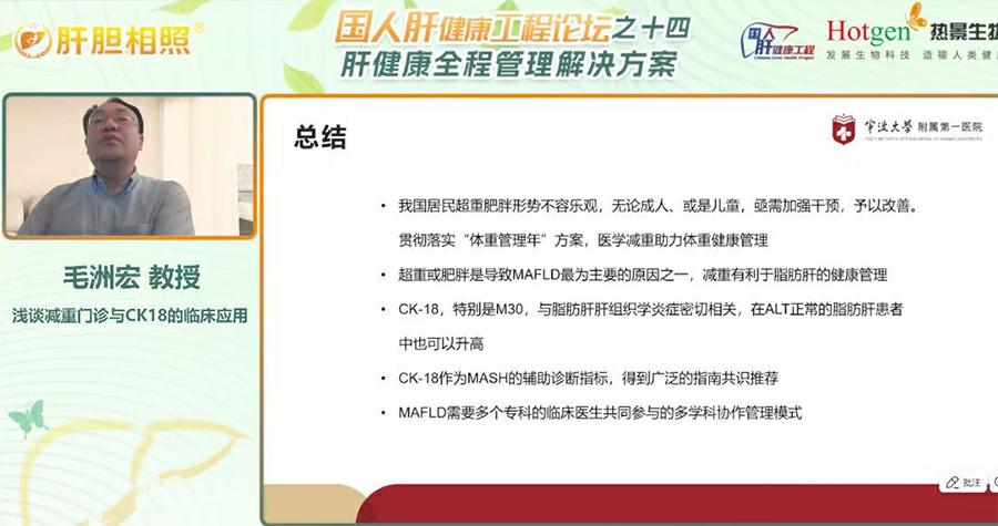 宁波大学附属第一医院内分泌科毛洲宏教授在会议上围绕“减重门诊与CK18的临床应用”作专题报告,强调国家卫健委“体重管理年”政策推动下,医疗机构需加强减重门诊建设,为超重及肥胖人群提供专业化服务。毛教授也以本院“肥胖俱乐部”在开设近十年的真实经验,给我们科普了减重管理的重要性。目前,我国超重肥胖形势严峻,超50%成人存在体重异常,肥胖与代谢相关脂肪性肝病(MAFLD)密切相关,约20% MAFLD患者可能进展为脂肪性肝炎(MASH),T2DM患者合并MAFLD比例高达65.04%。毛教授指出,传统检测手段如ALT、B超在早期诊断MASH及纤维化中存在局限性,而细胞角蛋白18(CK-18)片段作为新型生物标志物,通过M30/M65片段可无创评估肝细胞凋亡与坏死,其敏感性与特异性显著优于传统指标。此外,MAFLD需多学科协作管理,结合减重、改善代谢、抗纤维化等综合干预措施,定期监测高危人群。毛教授总结称,CK18的应用将推动MAFLD精准诊疗,而政策支持与多学科模式普及,为肥胖及相关代谢疾病防控注入新动力。