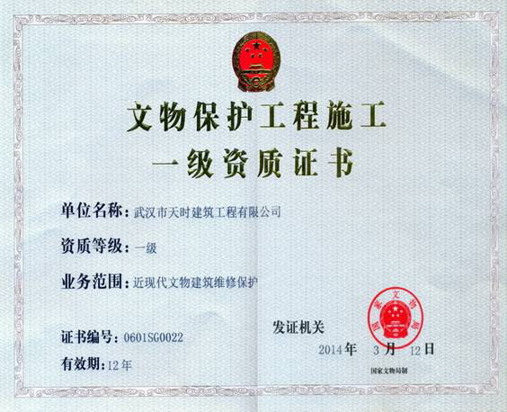 武汉市天时建筑工程有限公司荣升为文物保护工程施工壹级资质